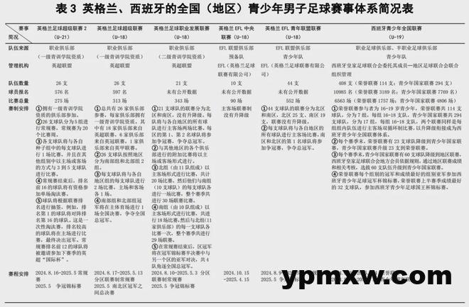 (1)赛事管理主体。德国U-17和U-19全国联赛在2024年之前是德国职业足球联盟主管,2024/2025赛季更换为德国足协主管,官方名称也由“Junioren Bundesliga”转变为“DFB Youth League”;意大利足协统管U-18以下赛事,该年龄段以上赛事交由职业联盟管理;英格兰的U-18和U-21赛事由英超联盟和英格兰足球联赛有限公司两个市场主体负责管理;西班牙U-19以下赛事(参赛队员年龄一般为16-19岁)由西班牙皇家足球联合会委托其成员地区足球联合会组织管理;日本则是赛事分类较多原因,由教育和体育领域的不同主体对各类赛事实施共同组织管理。
