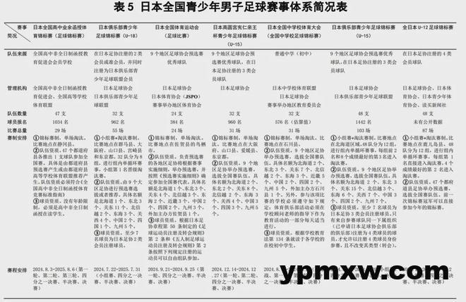 (2)赛制安排。与地方足协赛事相衔接的全国“主客场联赛+争冠锦标赛(升降级附加赛)”混合赛制是欧洲5国(地区)的全国(地区)青少年足球赛事体系的主要赛制安排。但在日本,除了针对U-18球队的“高円宮憲仁親王杯”超级联赛和王子联赛之外,其他赛事均是“地方锦标赛(选拔赛)+全国锦标赛”赛制,锦标赛制在地方和国家层面使用率都较高。