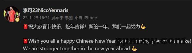 直播吧1月28日讯 今天是除夕夜,归化球员李可更新社媒,祝球迷们春节快乐,蛇年吉祥。