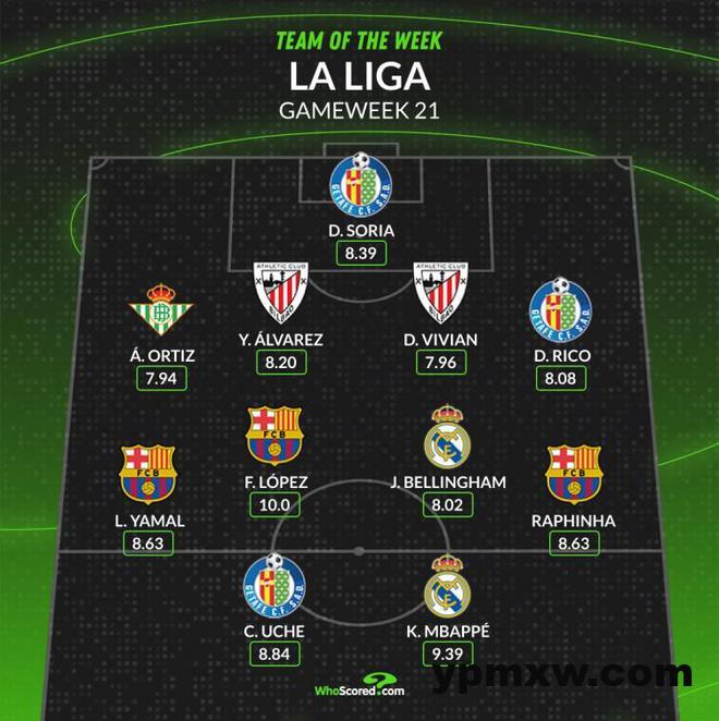 直播吧1月28日讯 西甲第21轮比赛战罢,WhoScored列出了本轮最佳阵容,姆巴佩、贝林厄姆、亚马尔、拉菲尼亚、费尔明在列。
