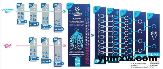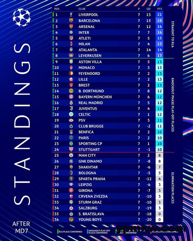 根据规则,欧冠联赛阶段前八名直接晋级十六强;9-24名进入到淘汰赛附加赛,其中9-16名为种子队,17-24名为非种子队;25-36名直接淘汰,不会再有降级到欧联的规则。