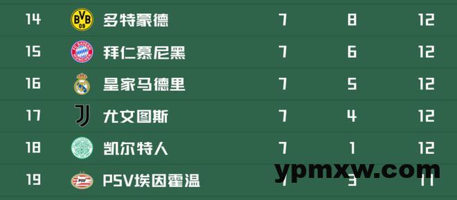 欧冠第14-19的六支球队居然都是前欧冠冠军,多特1冠,拜仁6冠,皇马15冠,尤文2冠,凯尔特人1冠,埃因霍温1冠。这6支球队想进入前八的可能性不大,但会力争一个更好地附加赛排位,同时期待惊喜。