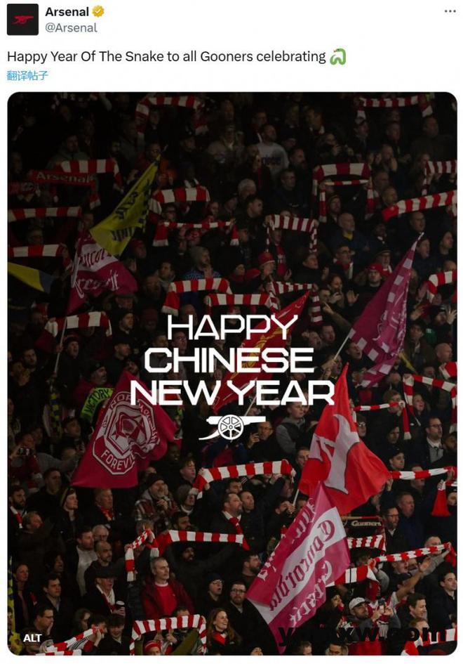 直播吧1月29日讯 新春佳节到来之际,阿森纳在官方社交媒体上晒出海报,祝阿森纳球迷们蛇年快乐。 枪手晒出了以球迷被背景的海报,并配文写道:“祝所有枪迷们蛇年快乐”。 KY体育新闻中心 KY体育·(中国)官方网站新闻中心 8轮全胜?利物浦对阵埃因霍温5胜1平,打进12球丢2球 世体预测巴萨vs亚特兰大首发:莱万领衔锋线 卢克曼缺阵