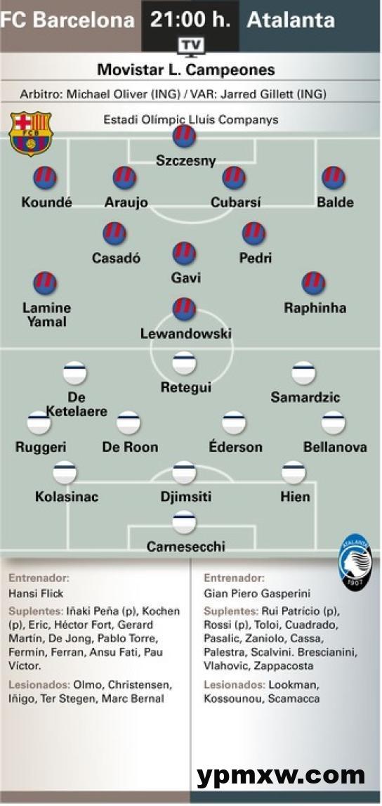 巴萨首发:什琴斯尼;孔德、阿劳霍、库巴西、巴尔德;卡萨多、加维、佩德里;亚马尔、莱万、拉菲尼亚