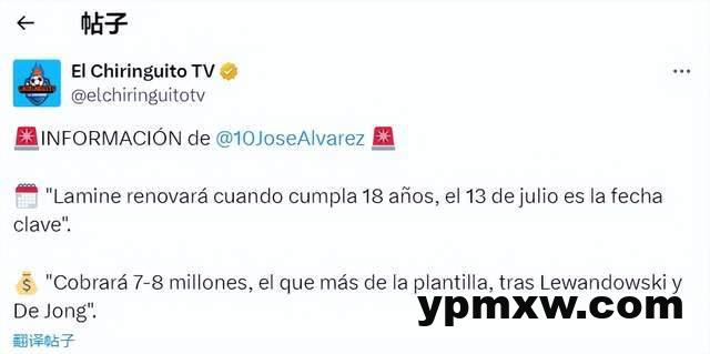 17岁的亚马尔,已是巴萨招牌巨星,德转身价估值高达1.8亿欧元。1月31日,西班牙6台足球节目El Chiringuito TV记者透露,巴萨即将与亚马尔完成续约,送上700万-800万欧元的税后年薪,这将是全队仅次于莱万、德容的高薪。