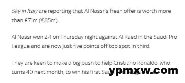 利雅得胜利没有放弃。天空体育透露,沙特土豪送上新的报价,总价值超过7100万英镑(8500万欧元)!胜利希望引进顶级好手,帮助即将40岁的C罗实现沙职联冠军目标。