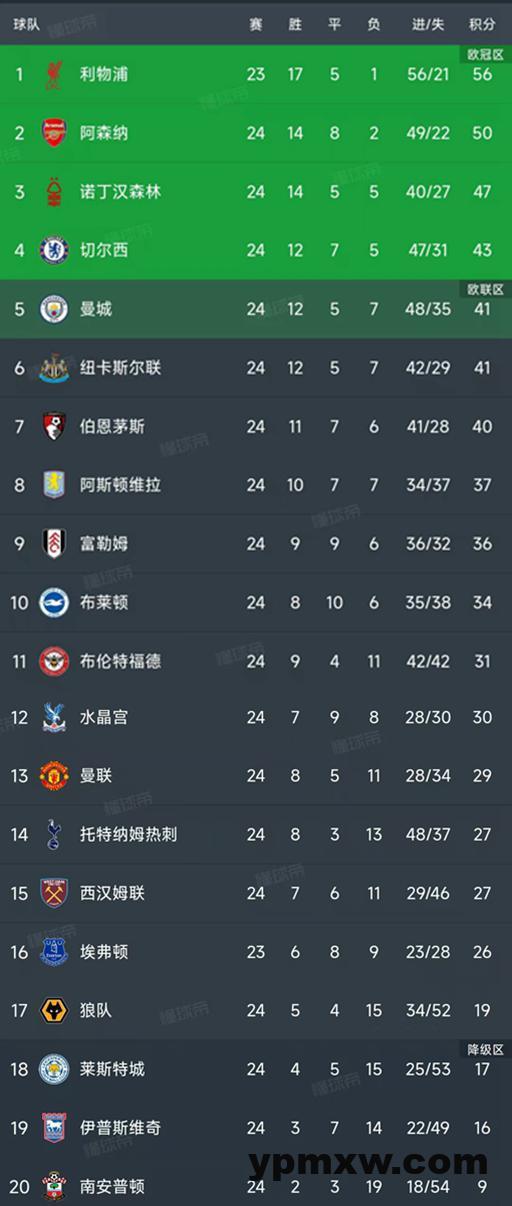 纽卡斯而联和曼城的积分都是41分,伯恩茅斯以40分暂列第7名。积分突破30分的球队还有37分的阿斯顿维拉、36分的富勒姆、34分的布莱顿、31分的布伦特福德、30分的水晶宫,以上球队排在第8-第12名。曼联、热刺、西汉姆联、埃弗顿和狼队暂列第13-第17名,他们的排名都高于降级区。
