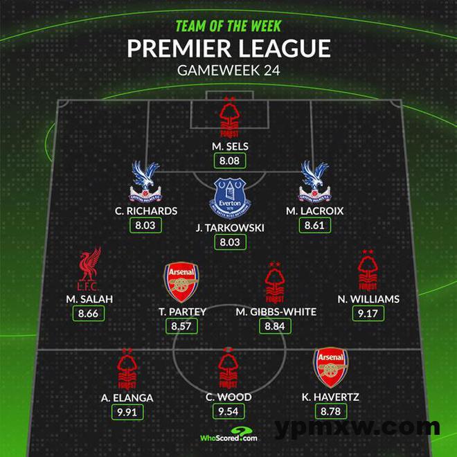 直播吧2月4日讯 英超第24轮比赛战罢,WhoScored根据球员评分排出了本轮最佳阵容,萨拉赫、哈弗茨、托马斯在列,诺丁汉森林5名球员入选。