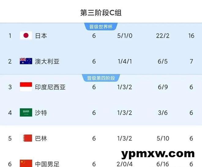 6、中国、6场球、2胜4负、积6分、进6球失16球、积6分、小组排名垫底。