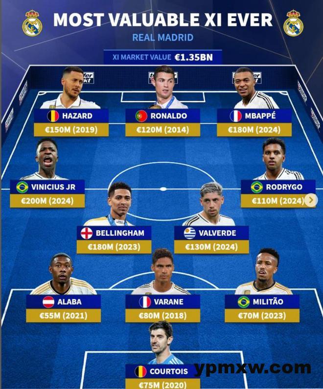 前锋:阿扎尔(2019,1.5亿)、C罗(2014,1.2亿)、姆巴佩(2024,1.8亿)