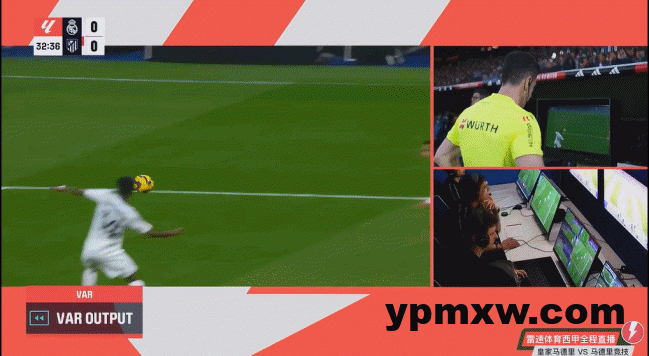 比赛第32分钟,皇马后卫楚阿梅尼禁区防守时踩到马竞球员利诺的脚,主裁观看VAR后判给马竞点球。