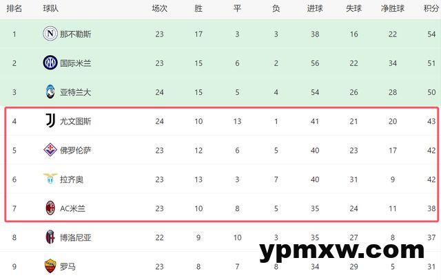 这场胜利,也让意甲的争四形势又乱了,原本已经快绝望的AC米兰,拿到3分之后,排名升上第7位。在少赛1场的情况下,AC米兰仅仅落后第四的尤文5分,双方的差距,随时有机会缩小到一场球以内。