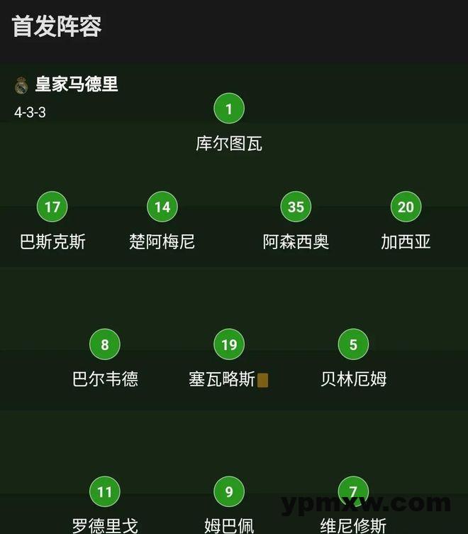 皇马方面,则是排出了4-3-3的阵型,罗德里戈,姆巴佩,维尼休斯三箭齐发,巴尔韦德,塞瓦略斯,贝林厄姆组成中场,巴斯克斯,楚阿梅尼,阿森西奥,加西亚组成四后卫,库尔图瓦把守大门。