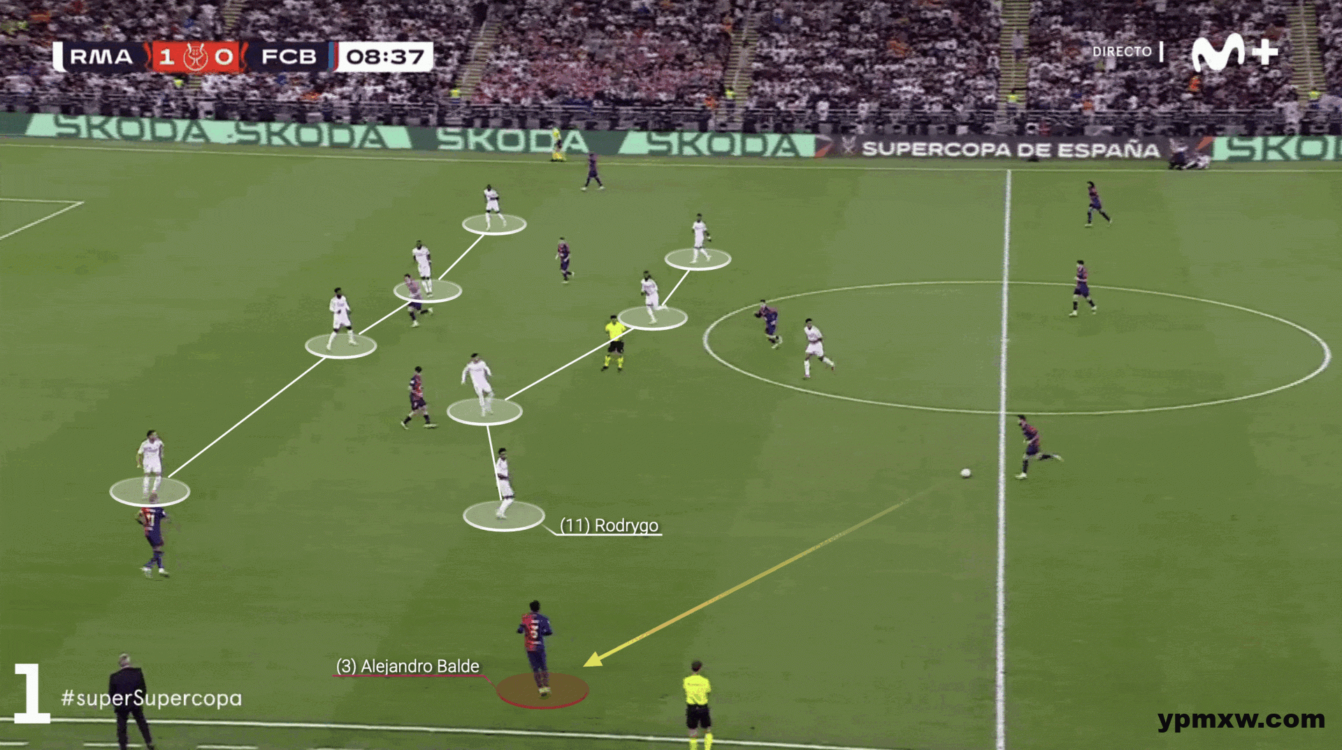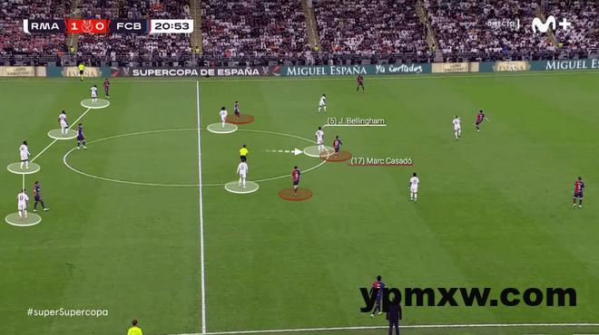 在几个月后的超级杯决赛中皇马尝试变得更加积极主动,让球员贴近对手球员进行防守,避免让巴萨在中场有太多时间进行控球。在这种战术下,贝林厄姆从左翼转到中路,紧盯巴萨的中场传球的球员,进行更为严格的盯人防守。
