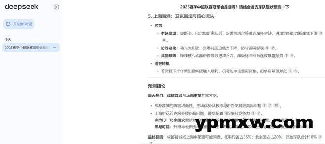 春节期间大火的不仅是电影《哪吒2》,还有AI软件DeepSeek。笔者尝试让DeepSeek预测新赛季中超冠军,让人比较惊讶的是,DeepSeek预测的新赛季中超冠军既不是卫冕冠军上海海港,也不是老牌强队北京国安和山东泰山,而是这支球队。
