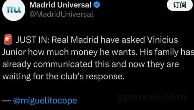 北京时间2月13日,科贝电台皇马跟队记者miguelitocope爆料皇家马德里已经直接询问维尼修斯团队想要多少钱,后者家人告知此事,现在正等待俱乐部答复。