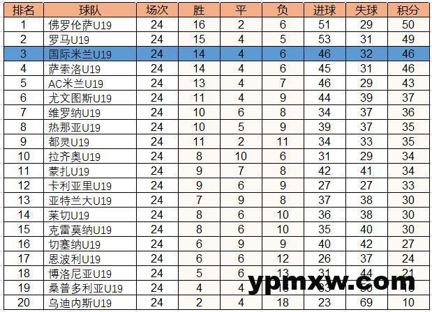 在意大利青年联赛当中,目前国米U19在结束的24轮比赛当中取得了14胜4平6负积46分的战绩,排名积分榜第三位;第一名佛罗伦萨U19积50分,第二名罗马U19积49分;上赛季冠军萨索洛则与国米同分、因进球数少一个排名第四;AC米兰以3分之差位列第五。