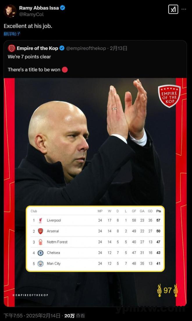 英超24轮战罢,利物浦积57分,以7分优势领跑积分榜,萨拉赫经纪人Ramy Abbas Issa转发积分榜,并配文:“他的工作做得很好。”