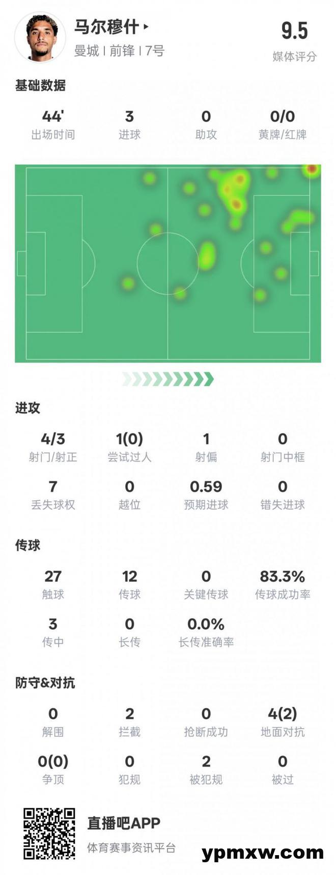 直播吧2月15日讯 英超第25轮,曼城半场3-0纽卡斯尔,马尔穆什戴帽,另外他还有2次拦截,半场评分9.5。