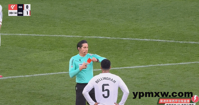 第39分钟,贝林厄姆不满判罚,喋喋不休向裁判抗议,被出示直接红牌,皇马剩下10人作战。