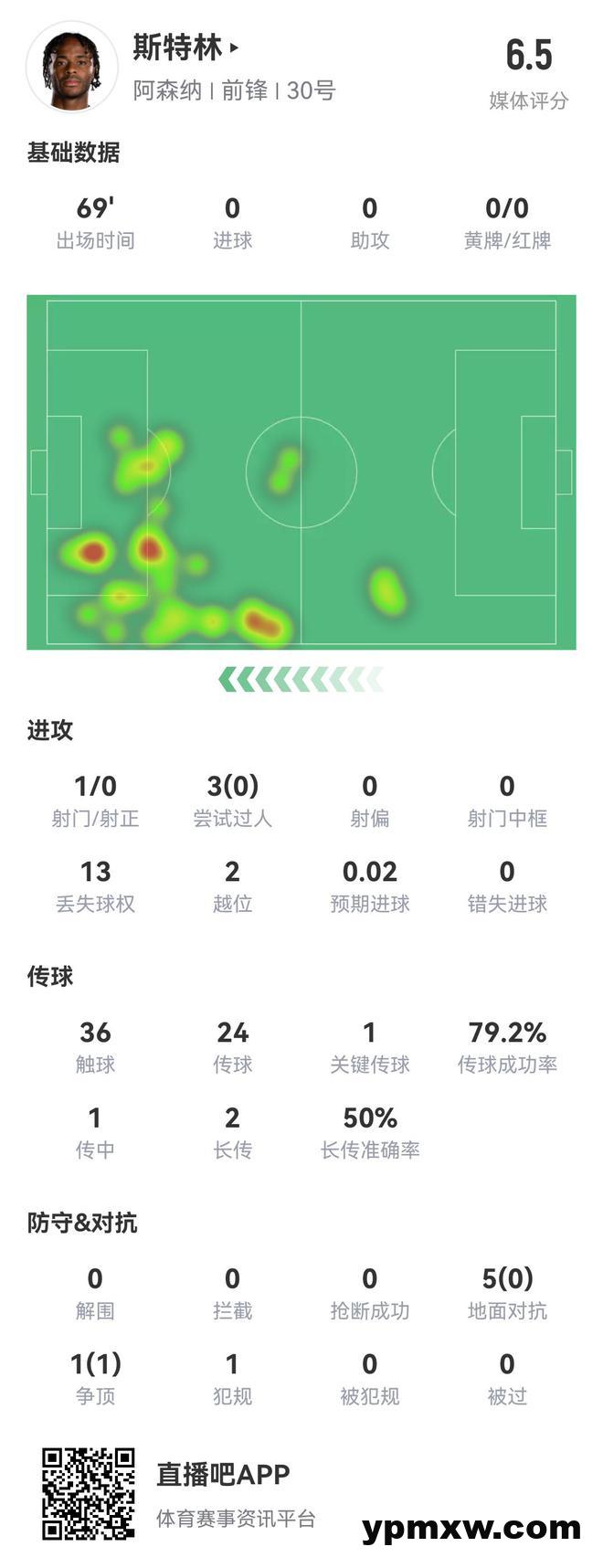 直播吧02月16日讯 英超第25轮,阿森纳客场2-0莱斯特城。斯特林本场比赛首发,在第69分钟被梅里诺换下。本场比赛斯特林数据惨淡,有多项数据挂0。