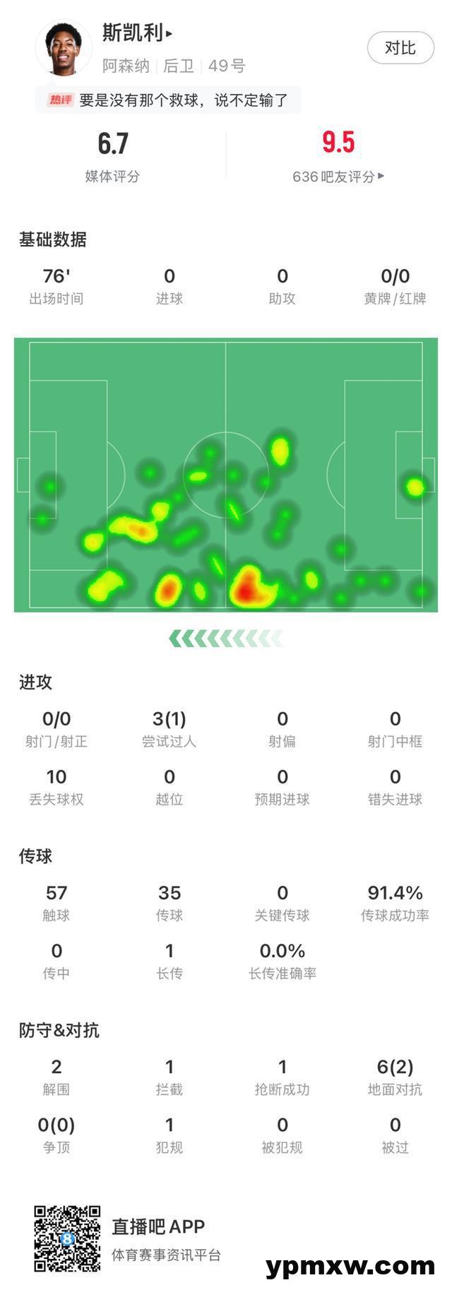比赛第73分钟,阿森纳中场传球失误,蓝狐就地反击,阿尤的传中在被碰入球门前,斯凯利关键的伸脚解围挽救了球队,让枪手避免在客场尾声阶段陷入落后。